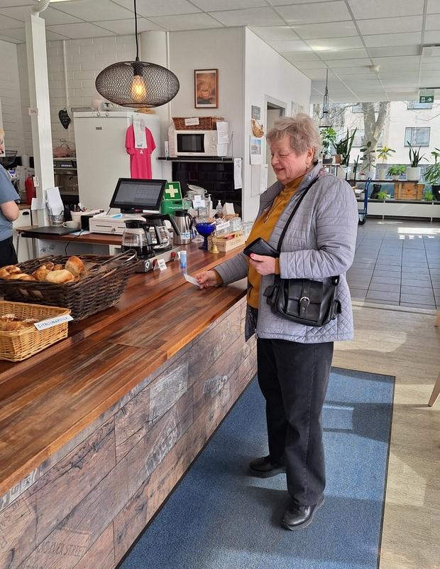 Matka jatkui Rajamäelle Cafe Muruun kahville, suolainen-/makea piirakka oli katettu valmiiksi. Matkanvetäjä Leila Kaarna hoitaa maksupuolen.