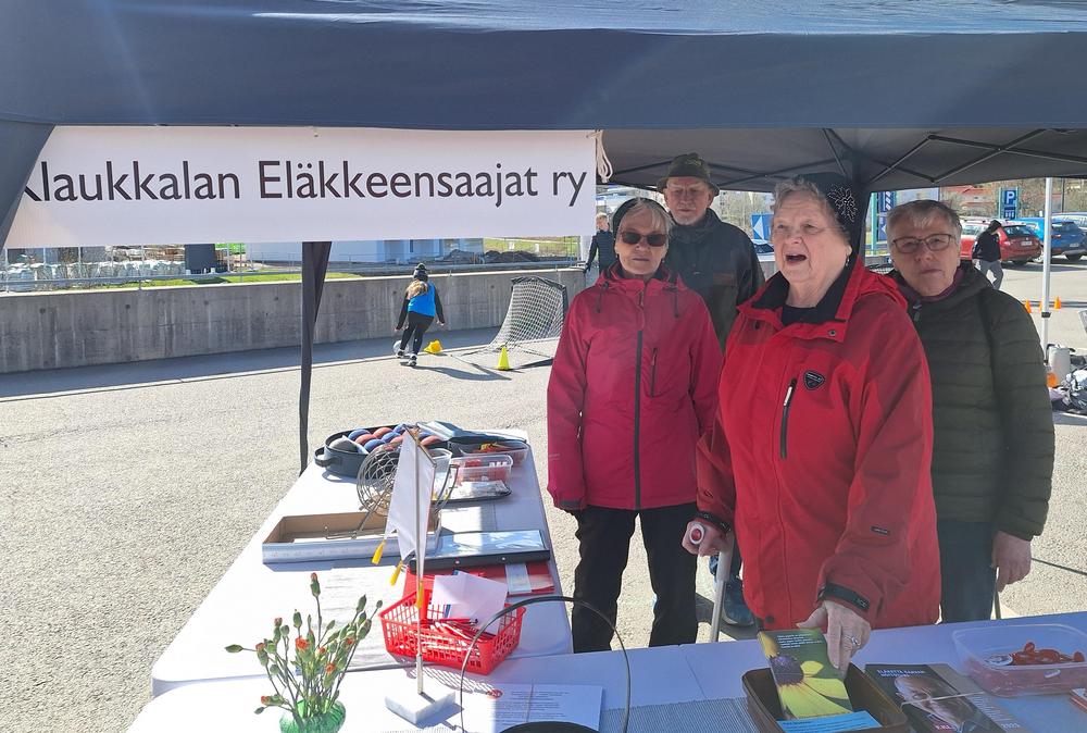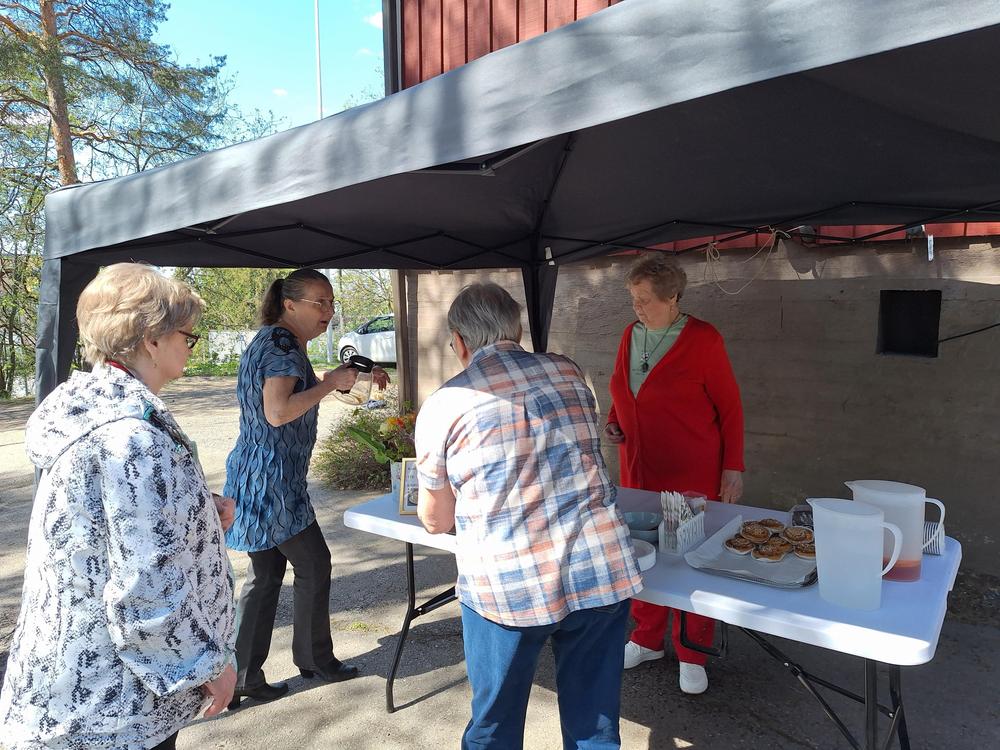 26.4.2025 HyväPäivä Markkinat Viirin pihapiirissä. Olimme telttamme kanssa esittäytymässä. Bingon pyöritystä, jos sai ennalta voittolistaan laitetun numeron niin sai suun makeaksi. Viileä tuulinen ilma, mutta olimme hyvin varustautuneina touhussa mukana. Kuvassa Leila Kaarna, Irmeli Salmi, Paula ja Erkki Huhtakallio. Mukana myös oli Merja Lönnqvist, Pirjo Salopelto ja kuvan ottanut Leena Puhakka.